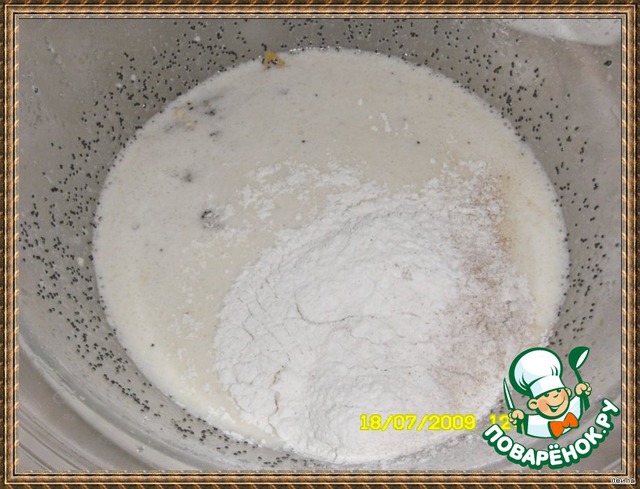 Смешать 75 гр мука + 1/2 ч.л. разрыхлитель + 1/2 ч.л. питьевой соды + 1/2 ст.л. молотой корицы + щепотка соли