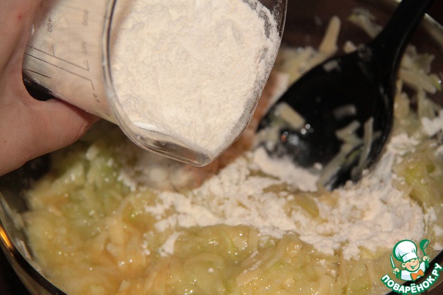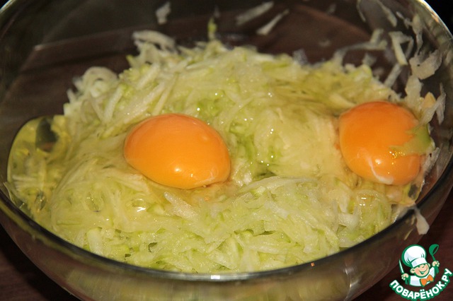 На крупной терке натереть кабачки и добавить 2 яйца.