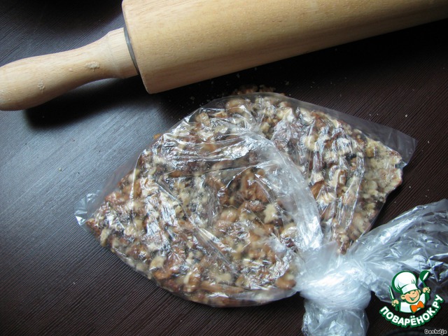 Орехи измельчить в мелкую крошку. Я для этого использую скалку :-D