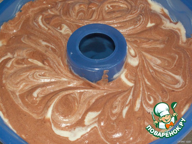 Форму для выпечки смазать растительным маслом и выложить тесто. Сначала кладeтся слой "светлого" теста, на него - слой "тeмного" теста.