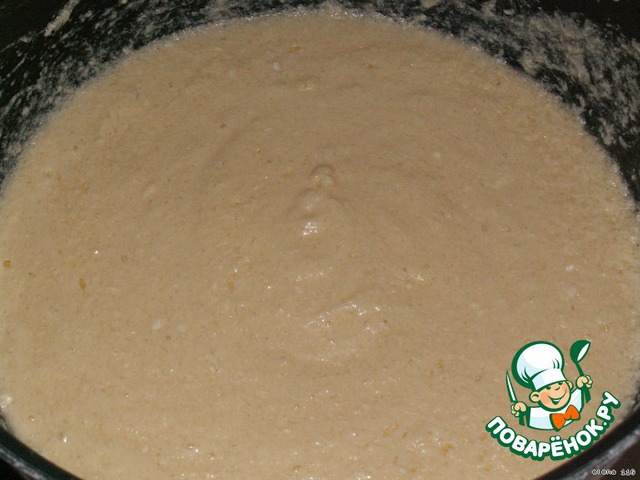 Муку смешать с крахмалом, постепенно засыпать в маргариново-яичную смесь, добавив молоко и воду. Ввести в конце разрыхлитель и хорошенько перемешать.