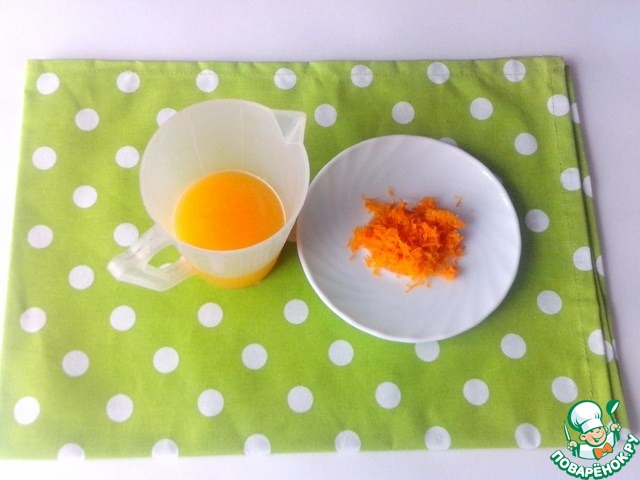 Апельсины (630 г) вымыть и вытереть. Снять цедру и выжать сок (у меня получилось 200 мл).