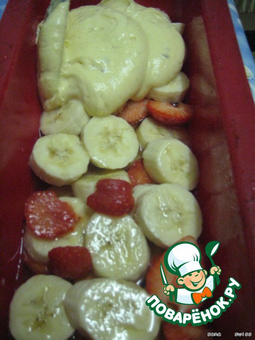 Перед тем, как вынимать из формы - кекс следует хорошо охладить, что бы фрукты застыли.