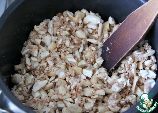 Порубить орехи крупно (я нашла в летнее время только кешью). В оригинал-рецепте стоят миндальные лепестки, с которыми вообще никакой мороки нет...