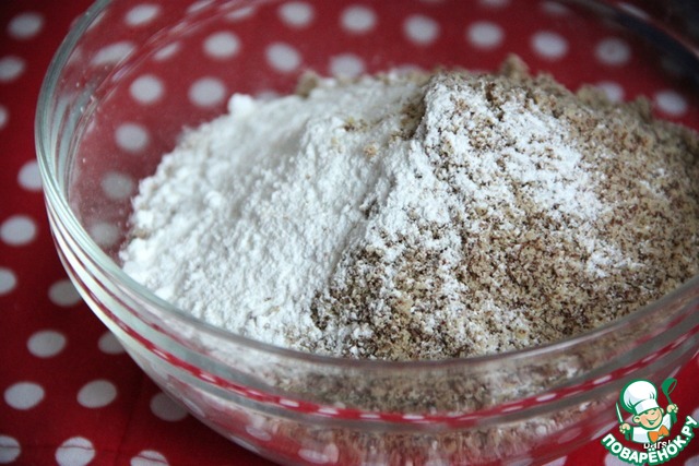 В отдельной миске смешать муку, разрыхлитель теста и молотые орехи