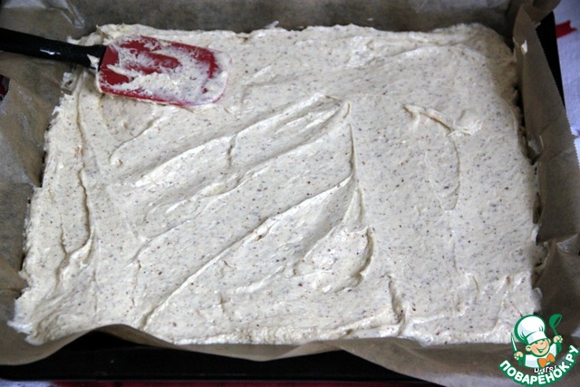 Противень или разъемные бортики 32 х 42 см выстелить бумагой для выпечки, распределить тесто