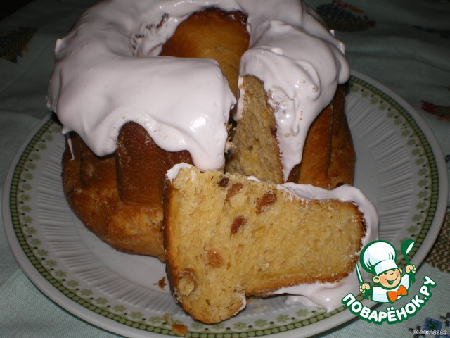 Дрожжи развести в тёплом молоке,добавить предварительно вымытые,обсушенные и обваленные в муке изюминки.Постепенно вводим желтки,сахар,ванилин,ром,цедру,размягчённое сливочное масло и муку.Замешиваем тесто и ставим его в тёплое место для "подхода". Следим за тестом,как только оно начнёт пузыриться и свободно отставать от стенок посуды,оно готово.(Это тесто можно накрыть крышкой и поставить на 1-2 дня в холодильник,а затем точно так же выпекать).Смазанную маслом и посыпанную сухарями (или манкой) форму наполнить тестом и поставить на 30 минут в тёплое место,чтобы тесто подошло.Выпекать в духовке при температуре 180 градусов в течение 45-60 минут.Когда кекс остынет,осторожно вынуть его из формы,прикрыть салфеткой и дать полностью остыть.Перед подачей на стол посыпать сахарной пудрой (или же как у меня покрыть глазурью).