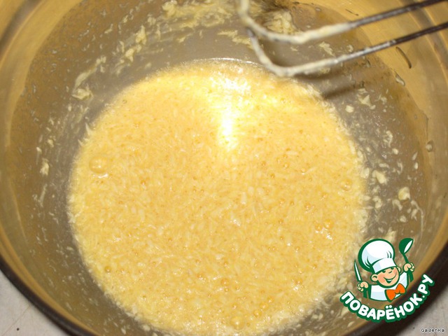 Сверху просеять муку с разрыхлителем и все перемешать, долго вымешивать не стоит, просто сделать тесто однородным. Лучше даже вручную. Тесто получается тяжелым и липким.