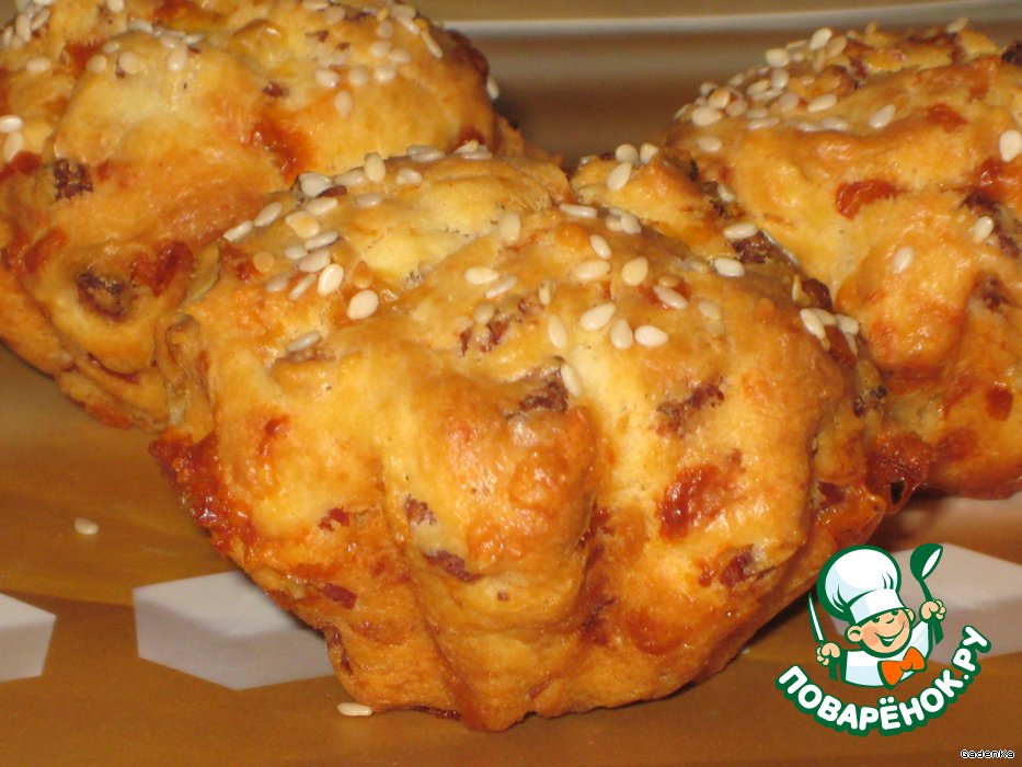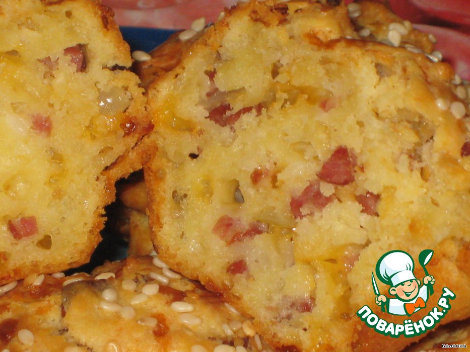 Тесто довольно тяжелое и выпекается долго. Лучше делать в маленьких формочках, а то за час ожидания под аромат сыра и копченостей на весь дом невозможно будет устоять.