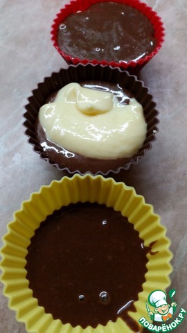 В формочки для кексов/маффинов укладываем слоями тесто 1 ст. л "с горкой"/начинка 1 ст. л./ тесто 1 ст. л. (все зависит от размера Ваших формочек). Отправить в разогретую до 180 градусов духовку на 15- 20 минут