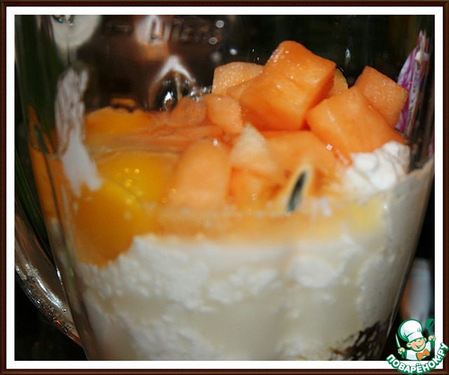 1. В блендере соединить творог (рикотту), 1/2 стак. сахара, молоко, 115 г дыни и яйца.