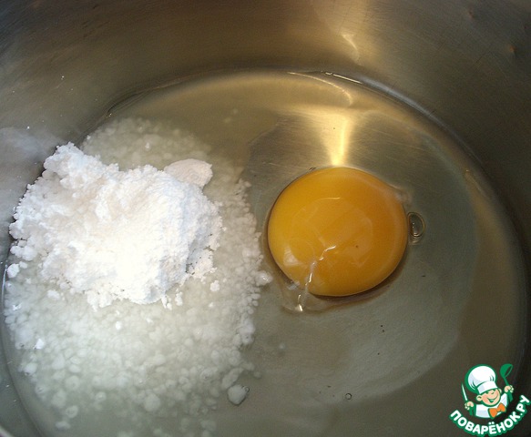 В кастрюле, подходящей для размещения на водяной бане, смешать одно яйцо, сахарную пудру и сок. Варить на водяной бане 5-10 минут до загустения смеси, следите, чтобы кастрюля не касалась воды.