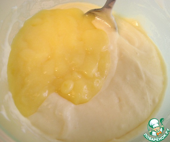 Тесто разделить на две части, в первую добавить лимонный курд и сок половины лимона. Смешать.