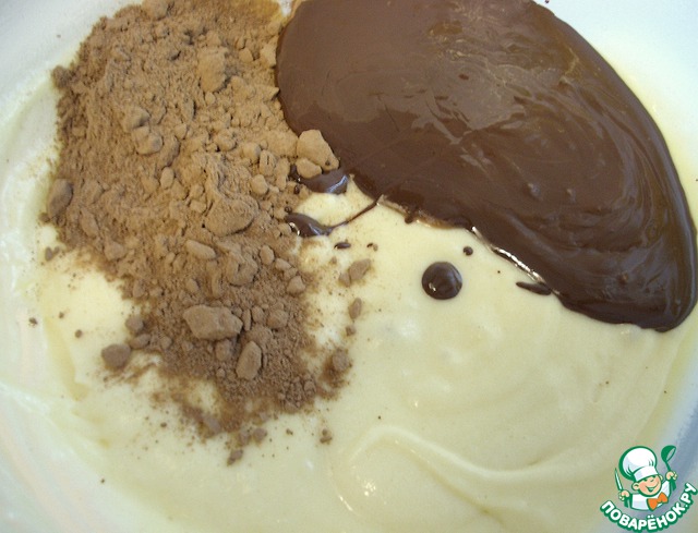 Во вторую добавить какао и растопленный шоколад (но не горячий!). Смешать.