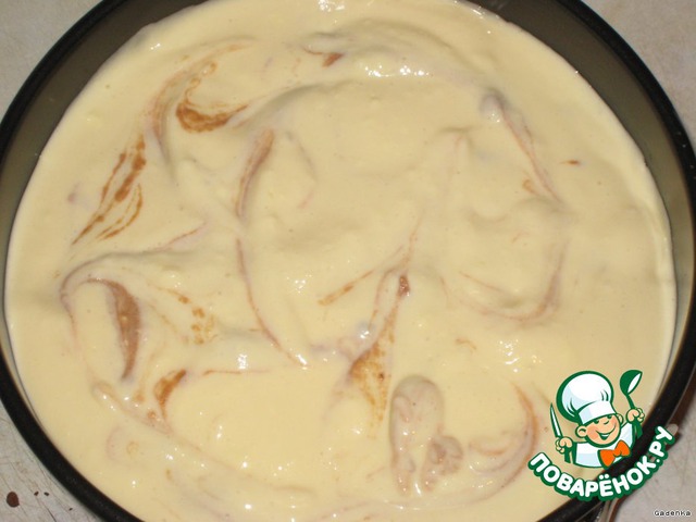 Сделать черенком от ложки несколько круговых движений, чтобы только маленько смешать массы.