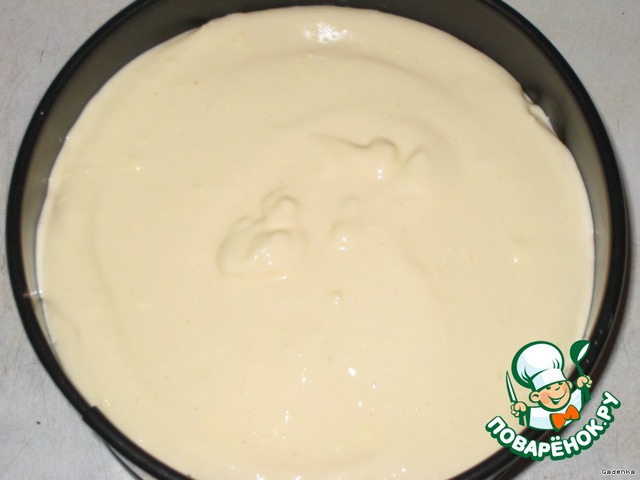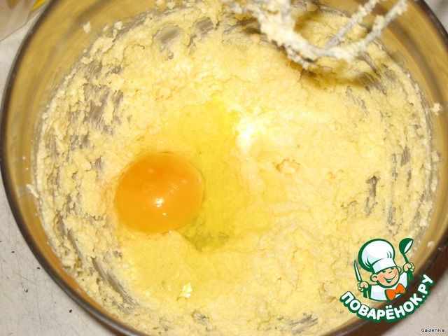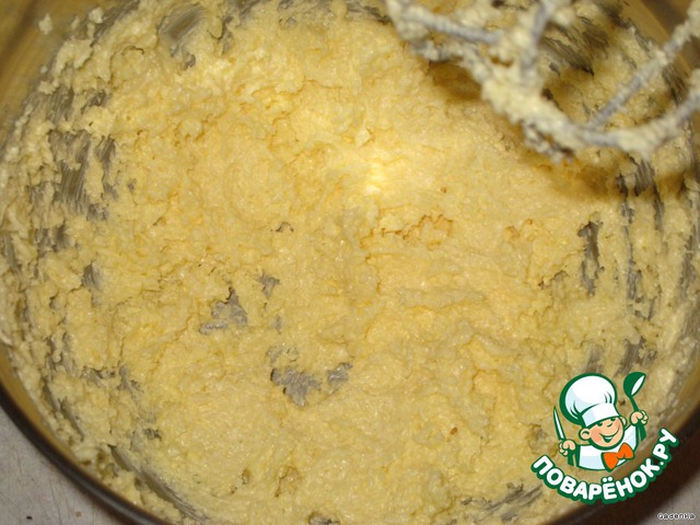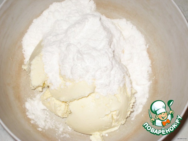 Для верхнего слоя, масло, сыр и сахарную пудру растереть, добавить сок лимона, добавить яйцо и недолго взбить, добавить муку и еще раз коротко взбить.