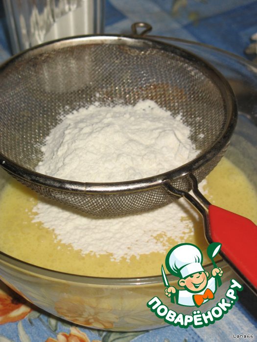 Просеять прямо в яично-маслянную массу и аккуратно перемешать.