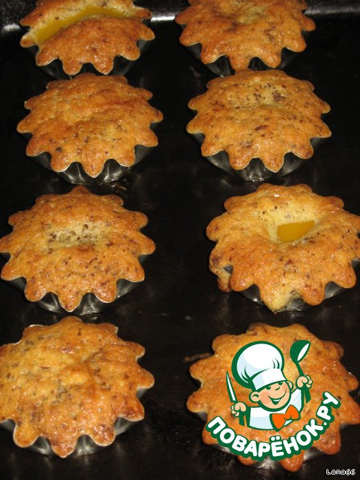 Уложить тесто на 2/3 формочки. В серединке углубить дольку персика выпуклой стороной вверх. У меня формочки были маленькие, поэтому я делила половинки долек еще на две части.