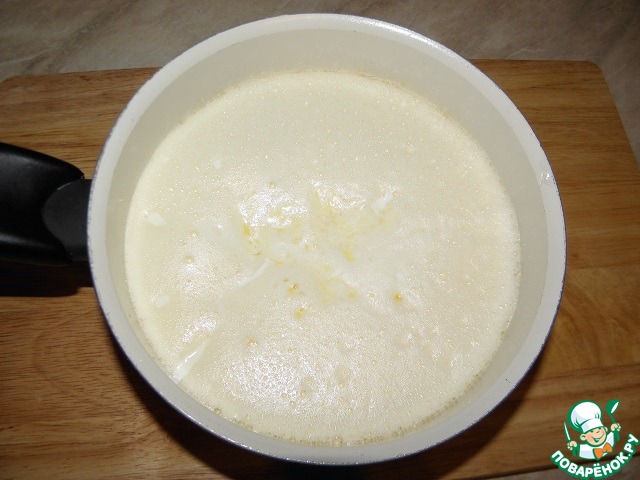 Продолжая взбивать, ввести растопленное масло, сметану и лимонад