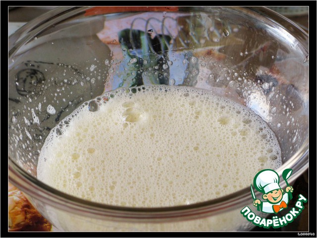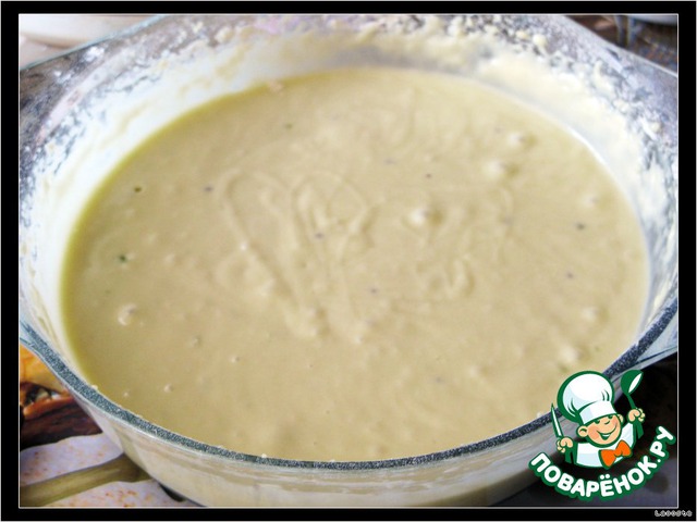 Затем, постепенно взбивая, всыпать муку, перемешанную с разрыхлителем и замесить тесто.Тесто должно быть не очень густым.