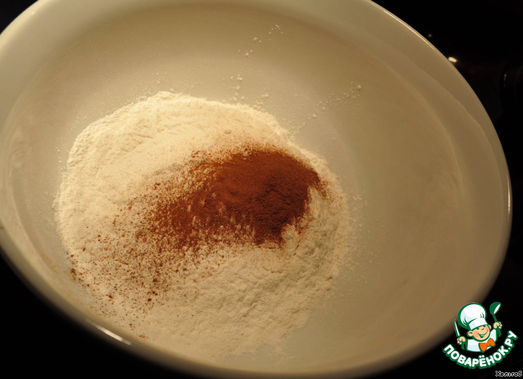 В большую чашу насыпем 2 чашки муки и по чайной ложке соды, разрыхлителя теста, соли, гвоздики и корицы. Перемешаем.