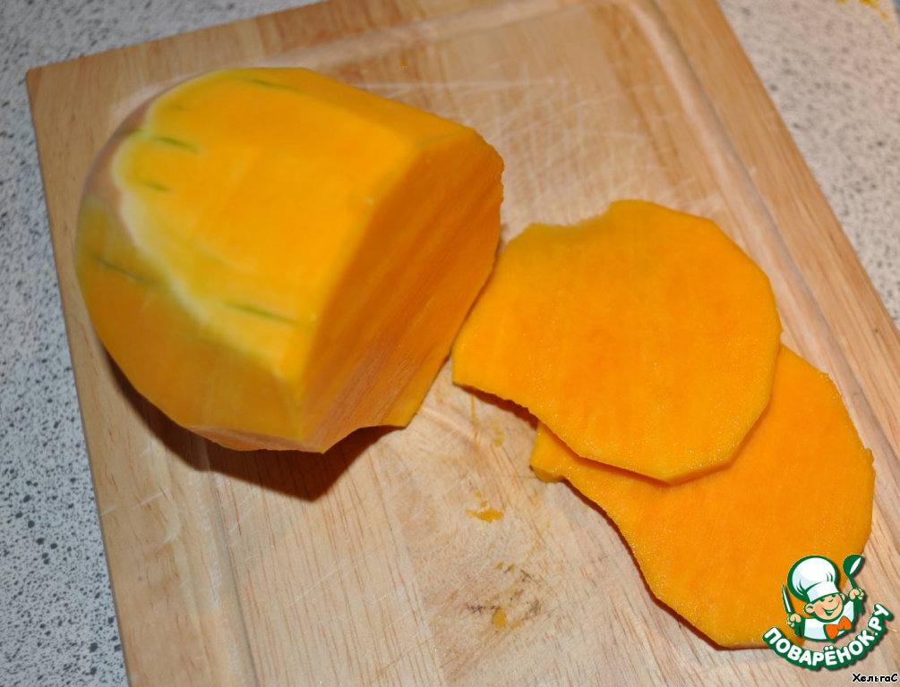 Пока коржи пекутся, займемся кремом. Сначала нарежем тыкву.