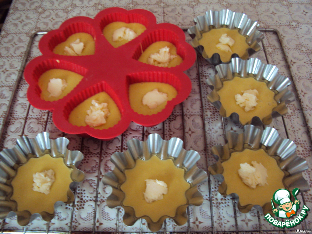 Тесто разлить по смазанным формочкам на 1/2 высоты, сверху на тесто выложить по кусочку сливочного масла.