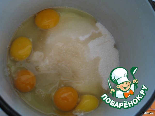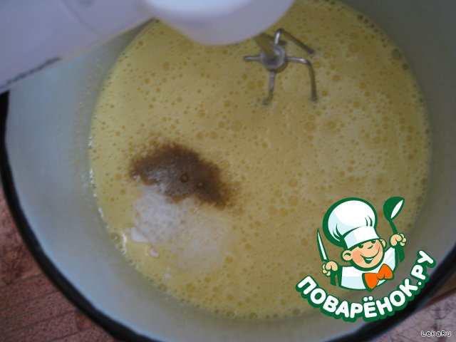 Положить чайную ложку гашеной соды. И для аромата корицу (или ванилин). Перемешать. Затем муку и тщательно перемешать до однородности.