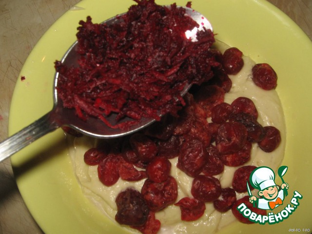 Тесто делим на три части. В одну часть, добавляем вяленую вишню (можно заменить любыми сухофруктами), и натёртую свеклу.