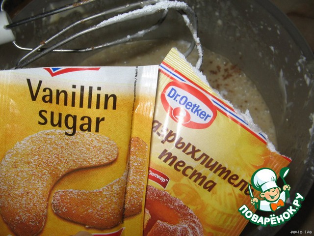 Разрыхлитель (или 0,5 чайной ложки соды, погашенной уксусом) и ванильный сахар.