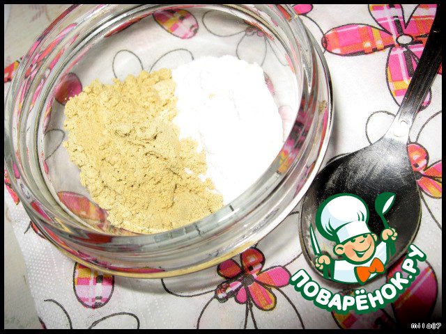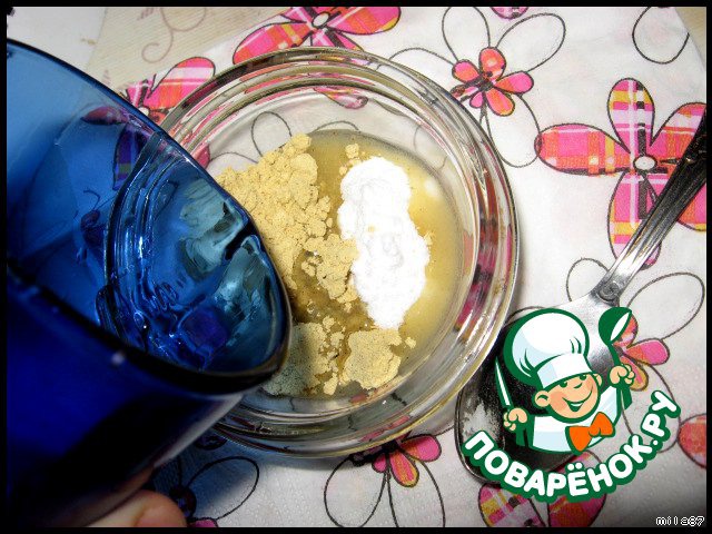 Затем в сосуд наливаем сразу(!)3 ст л воды и заливаем водой горчицу и соду.