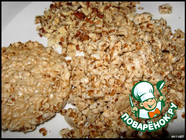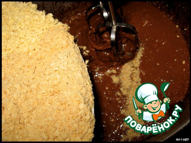 Орехово-крекерную крошку вмешиваем в шоколадно-кефирную смесь.