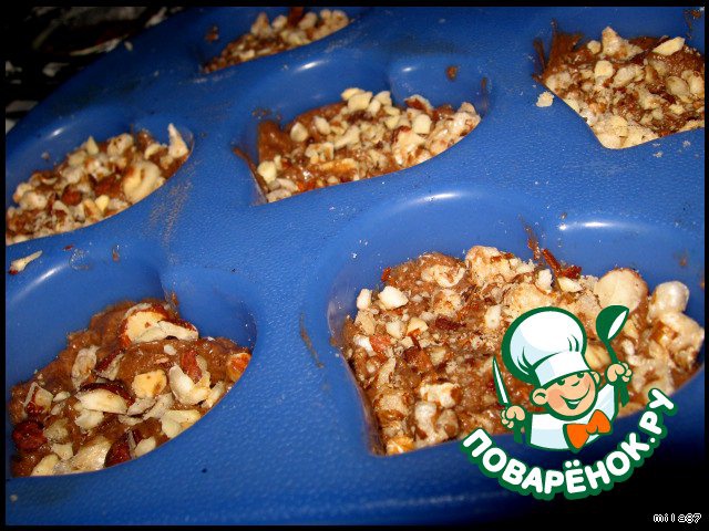 Форму на 2/3 заполняем тестом.Затем выкладываем молотую смесь(орехи и слайсы),слегка утапливая в тесто.