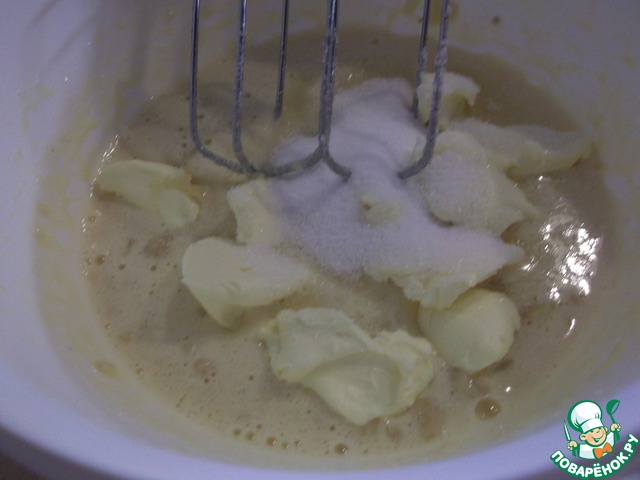 Добавим маргарин (сл. масло), сахар, ванильный сахар, соль и ароматизатор ( я не добавляла) и взбиваем до тех пор, пока сахар не растворится.