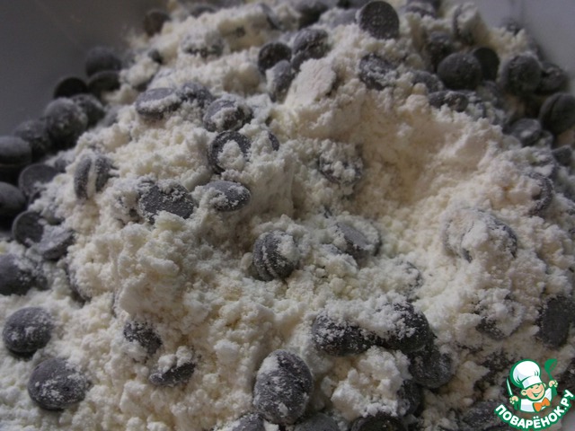 Муку, крахмал, миндаль, разрыхлитель соединить и добавить к ним шоколадные капли. Перемешать.
