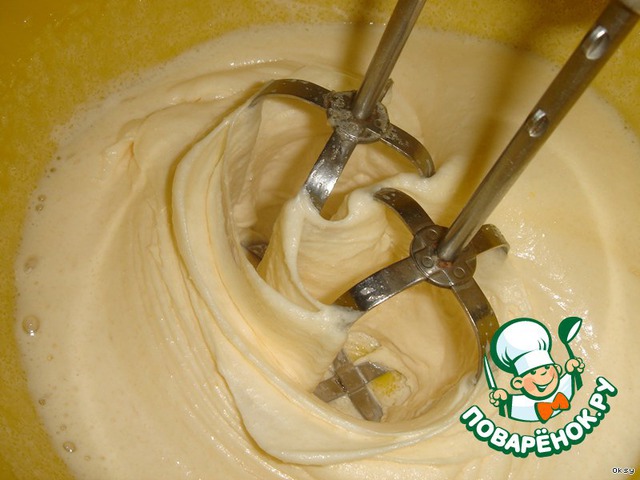 Яйца с сахаром взбить, добавить размягченный маргарин.