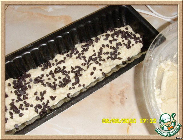 Форму смазать маслом, выложить половину нормы теста, обсыпать шоколадными хлопьями (стружками).