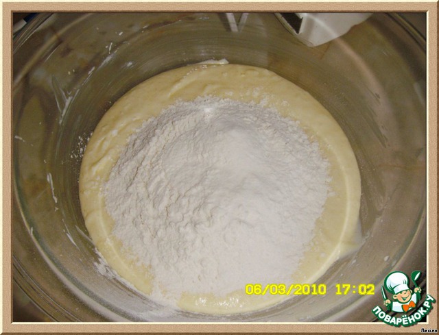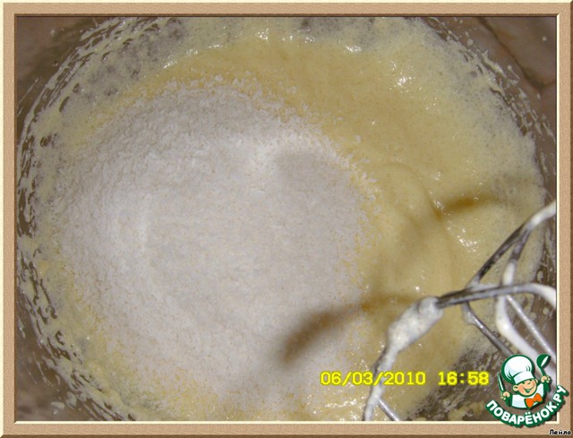 Затем просеянную муку с разрыхлителем, после дробленый черный шоколад ([i]сделала иначе[/i]).
