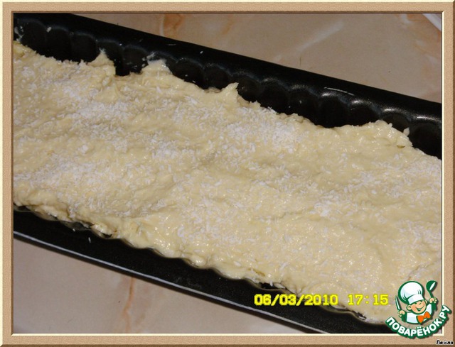 Сверху выложить остальное тесто, разровнять тесто. [i]Дополнительно обсыпала кокос. стружкой.[/i]