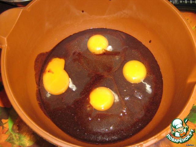 В остывшую шоколадную массу добавить яйца и хорошо взбить.