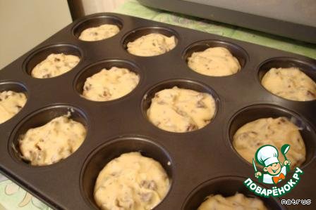 Всыпать разрыхлитель и муку, быстро замесить не очень крутое тесто. Если месить долго, то маффины получаются не такие нежные.
