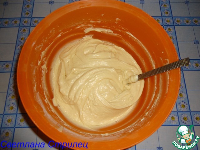Сливочный творожный сыр растираем с половинкой яйца (половинку мы кладем в тесто) и 30 г сахарного песка. Наш крем готов.