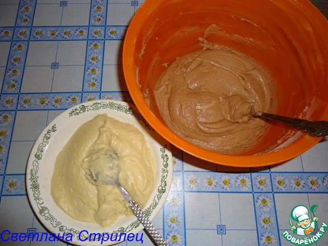 Одну треть теста оставляем белой, в две трети теста я добавила просеянное какао.