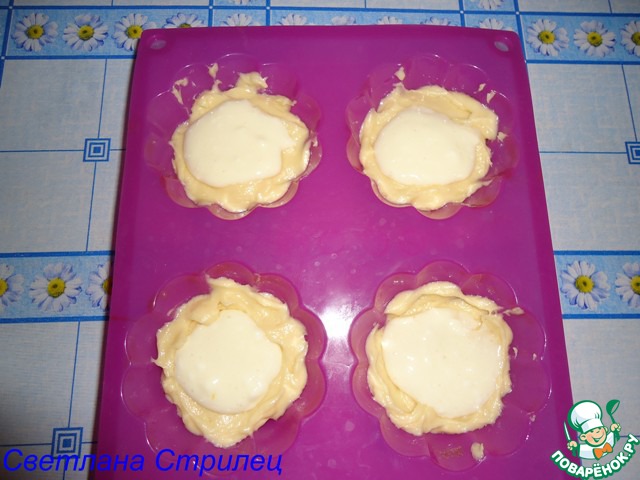 Итак, приготовим первый вариант. В силиконовую форму для кексиков выкладываем примерно 2 столовые ложки светлого теста, сверху на тесто кладем 1,5-2 чайные ложечки начинки из сливочного сыра,