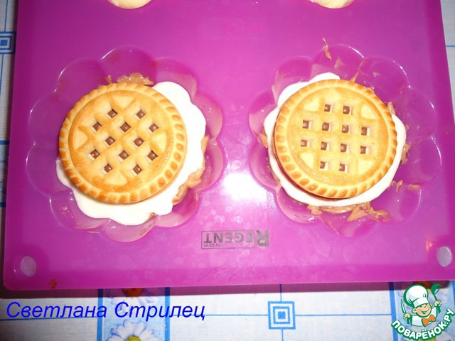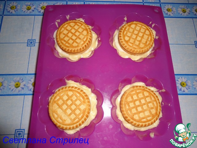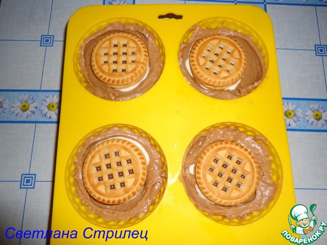 на начинку кладем светлое печенье с коричневой начинкой, чуть вдавливаем в тесто.