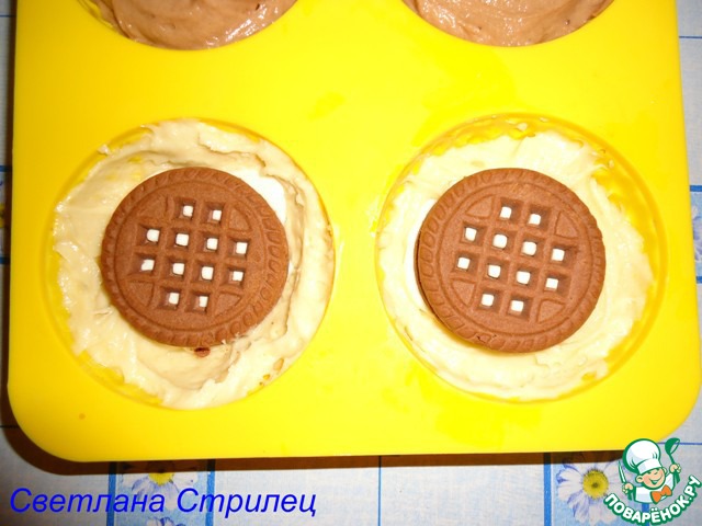 Теперь готовим темные кексики. В силиконовую форму для кексиков выкладываем примерно 2 столовые ложки коричневого теста, сверху на тесто кладем 1,5-2 чайные ложечки начинки из сливочного сыра, на начинку кладем светлое печенье с коричневой начинкой, чуть вдавливаем в тесто. Сверху на печенье кладем еще немного теста, ложечкой аккуратно снова "прячем " печенье.
