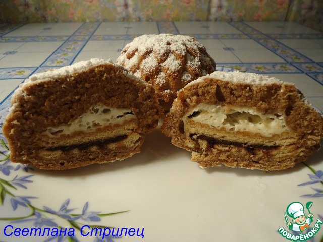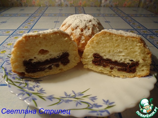 | Идею таких замечательных кексиков взяла у автора Нуар на американском кулинарном сайте, сам рецепт я не брала (там изготовлялись кексики из готовой пачки смеси для шоколадных кексов, начинка была одного вида). Я пофантазировала с разным печеньем, получилось сразу 4 варианта начинки. Очень интересные и вкусные кексики получаются по этому рецепту! Вам надо обязательно попробовать! И незамедлительно! |