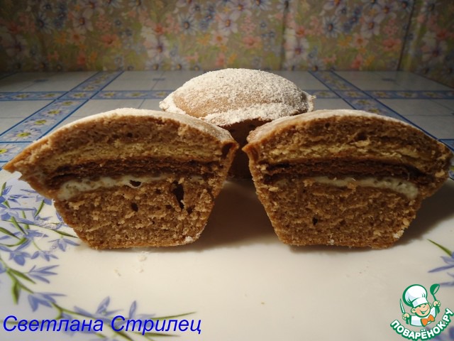 По той же технологии делаем белые кексики с темным печеньем. Выпекаем кексики при температуре 160С примерно 40 минут. Посыпаем сахарной пудрой.