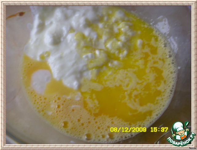 В большой чашке смешать яйцо, йогурт, масло растопленное, ванильную эссенцию.