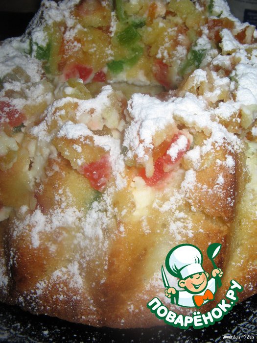 | Рецепт этот нашла в книжечке, которая прилагалась к силиконовой форме. Оказалось очень вкусно, но там рецепт был дан для формы "Буханка", а я сделала в своeм "Кугелькопфе". На вкус это никак не повлияло, а вид немного подкачал, хотя так показалось только мне, потому что все, кто его ел, на вид и внимания не обратили. Кекс - наивкуснейший просто, с ярко выраженным сливочным вкусом, с приятной кислинкой цукатов. Структура влажновато-воздушная, крем - нежнейший. |